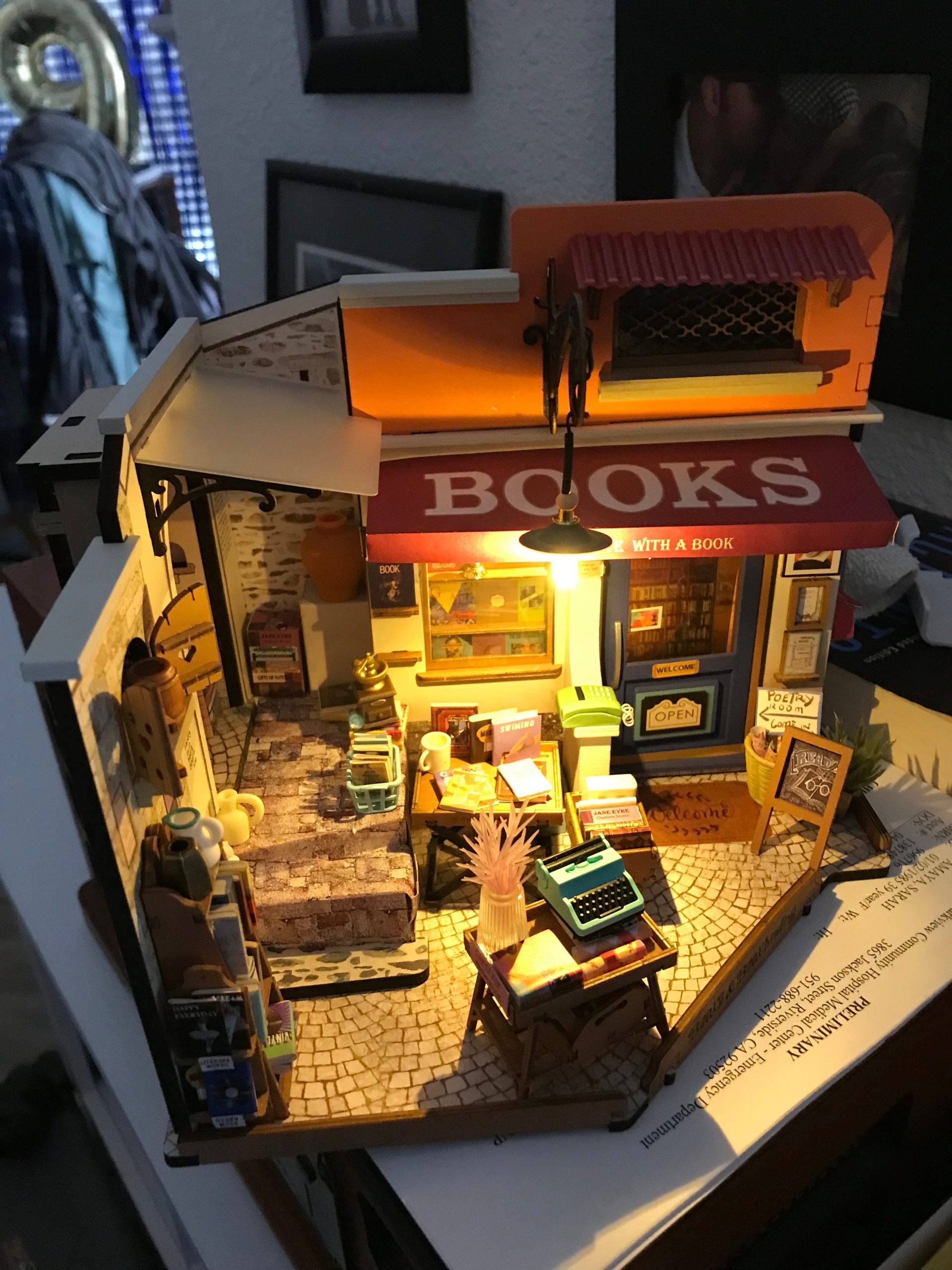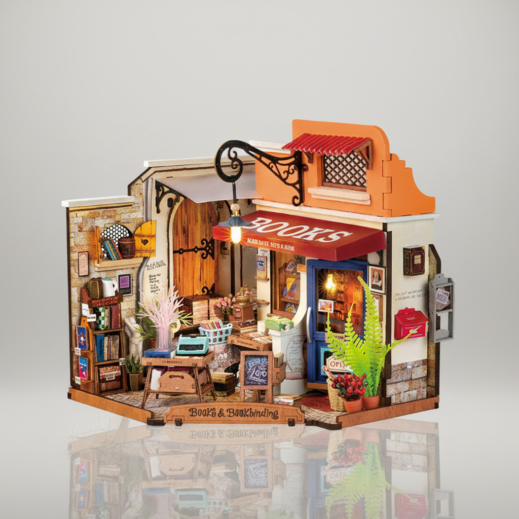 shows an outdoor scene of a used bookshop in a small alley corner. Its unique style makes you feel like you’re in a literary-filled town. Famous for its long history and many used books, it’s a special spot in the local area. The book area offers a variety of books for different readers. Next to the main entrance, there’s a window displaying carefully chosen books and antiques collected by the owner, giving you a peek into the store’s history. Moving to the side, the owner creatively used every space, adding plants and classical statues, creating a strong artistic atmosphere. These decorations not only make the store more attractive but also give you a pleasant place to read in this charming bookstore. Rolife Corner Bookstore’s design perfectly captures the feel of an outdoor bookstore, giving book lovers a chance to experience outdoor reading again. With its well-made design and detailed props, you can enjoy assembling it and get a perfect miniature model to display. This mini scene is not just art but also holds beautiful memories, letting you imagine the nostalgic outdoor reading moments.